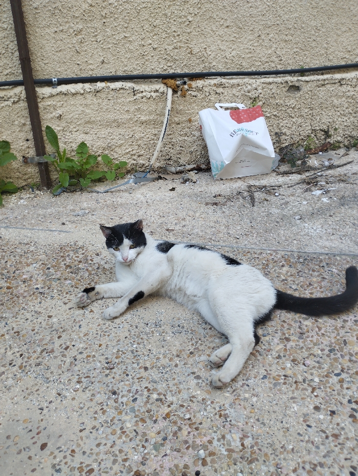 - "A black and white domestic short-haired cat is observed lying on its left side on an exposed aggregate concrete surface in an outdoor urban area in Unknown, Unknown" by FM-pIDc62, licensed under CC BY 4.0