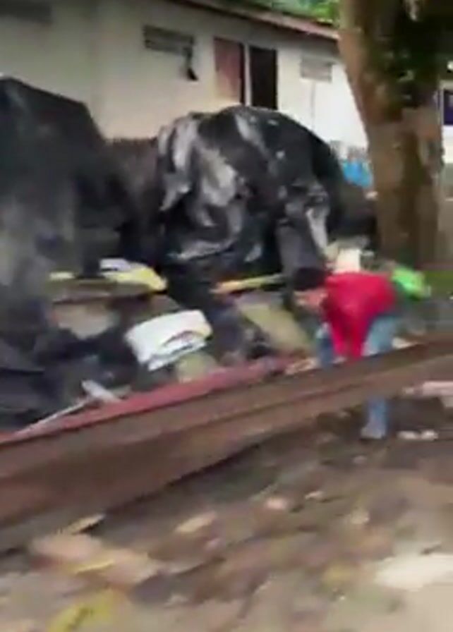 debris-filled yard in front of a modest, possibly rural, house. Two people are visible at the start, one wearing a blue shirt and another in a green shirt. They are moving around the yard. The yard is filled with miscellaneous materials, including scrap wood, plastic tarps, and general debris. The house is a simple, single-story structure with what looks like laundry hanging outside. The background consists of green trees and dense vegetation. The video pans across the yard, showing more of the scattered debris.