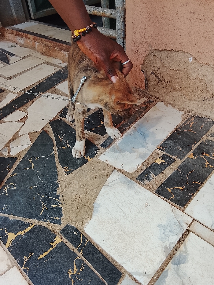 In the city of Unknown, Unknown, a close-up image captures a dark-skinned human hand gently touching the head of a small, brindle-patterned dog. The hand displays a multi-colored beaded bracelet and a silver ring on the ring finger. The dog, with white paws, is secured by a metal chain collar and leash, and looks downwards. They stand on a floor paved with irregularly shaped black (featuring gold-like veining) and white/light grey tiles, separated by wide, dirt-filled grout lines. A damaged reddish-brown wall with exposed underlying material is visible to the right. A portion of a green metal gate is present in the upper left background.