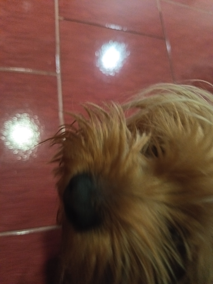 The scene depicts an extreme close-up of a domestic animal, specifically a small dog, positioned on a tiled floor in an indoor setting within Cherven Bryag, Bulgaria. The dog, largely obscured by its own fur, exhibits light brown to tan coloration across its body and head. A prominent, dark, and seemingly wet nose is visible on the left side of the animal's head. The fur appears disheveled. The dog is oriented facing towards the left side of the frame, with its head low, near the floor surface. The background consists of a reddish-brown tiled floor, characterized by visible grout lines forming a grid pattern. Two distinct, circular, blurred reflections of artificial light sources are present on the tiled surface in the upper left and upper central portions of the image. No human subjects or discernible interactions are present in the frame.