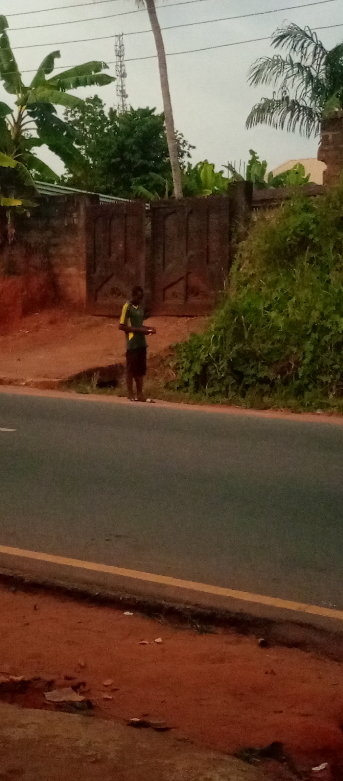 A solitary person stands on the edge of a paved road, next to a wall with arched openings, partially obscured by overgrown greenery. The person wears a dark shirt with yellow arm stripes and shorts. In the background, beyond the wall, are leafy trees and a telecommunications tower. The sky is overcast, casting a subdued light over the scene.