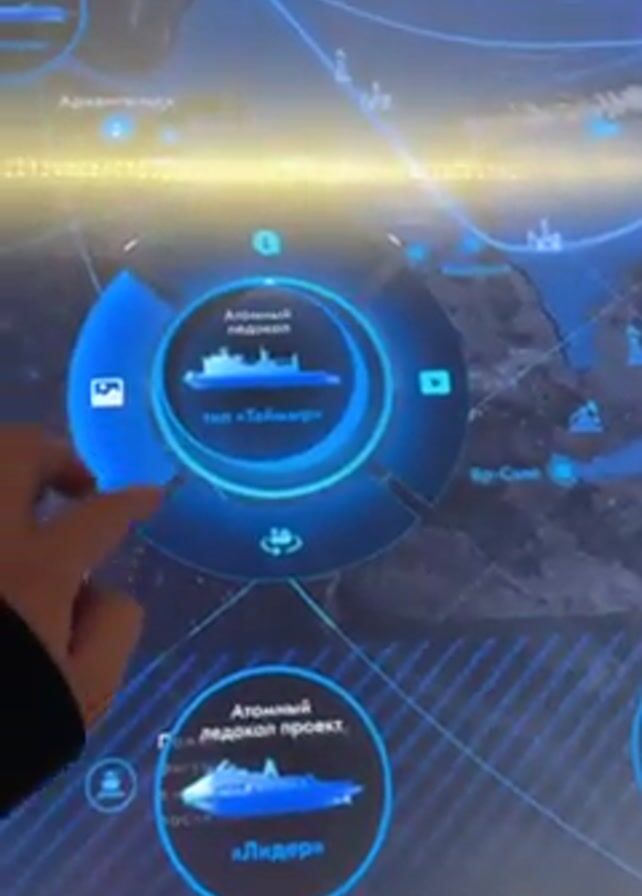 Here is a detailed description of the video: The video shows a person interacting with a large touchscreen display. The screen appears to be an interactive map focusing on Arctic regions, including areas like Murmansk and the Barents Sea. The person selects a graphic icon on the screen, which brings up a series of images of icebreakers. Specifically, the images showcase icebreakers of the "Taimyr" type. The person navigates through the images by using touch gestures on the screen. The display is set in a modern, well-lit environment, possibly a museum or exhibition hall. The person's hand and part of their sleeve are visible as they interact with the display.
