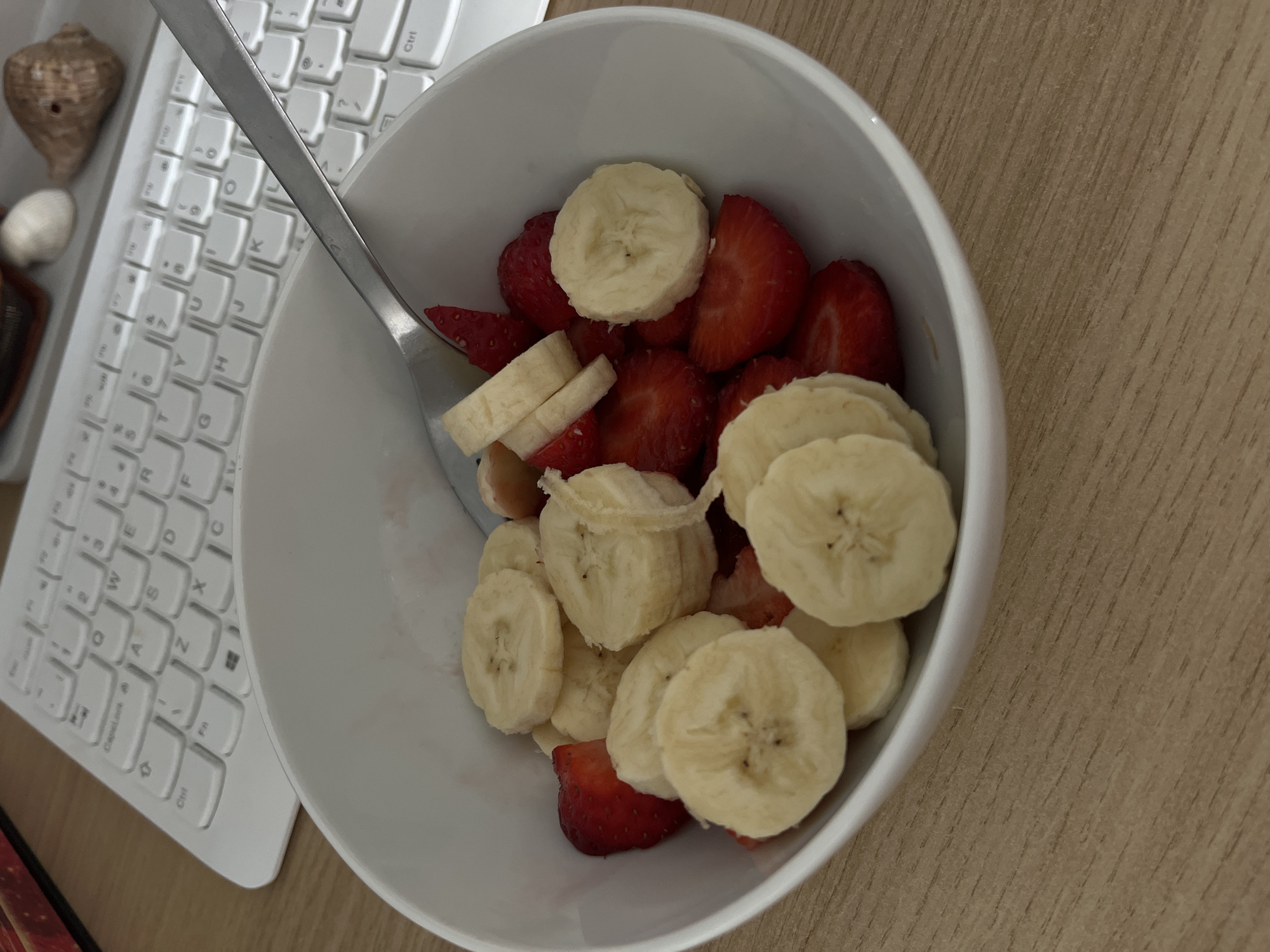 This image presents a top-down view of a white ceramic bowl filled with sliced fruit, located on a light-colored wooden desk in Sofia, Bulgaria. The bowl contains numerous circular slices of banana and irregular pieces of red strawberry. A silver-colored spoon rests inside the bowl, partially submerged among the fruit. Behind the bowl, a white computer keyboard with a standard QWERTY layout is partially visible. On the upper right portion of the keyboard, two small decorative objects are present: a smooth, off-white, irregular piece and a ridged, light-brown seashell. The wooden desk surface exhibits a visible linear grain pattern. No individuals are depicted.