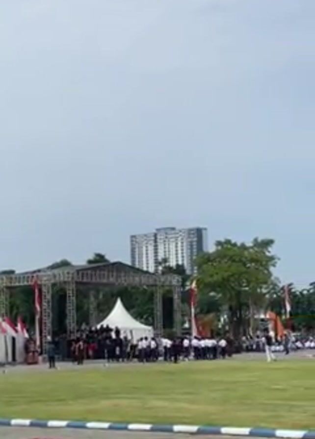 n outdoor event. A group of people dressed in white uniforms and black pants are assembled on a green field, in front of a stage set up with lights and speakers. A smaller group of people stands on the stage. There is a large red carpet in the foreground. The video pans to the right, showing a large building with a tiered roof and a tall, slender minaret topped with a crescent moon. The camera continues to pan, revealing the Indonesian flag waving on a tall pole. The sky is overcast and hazy.