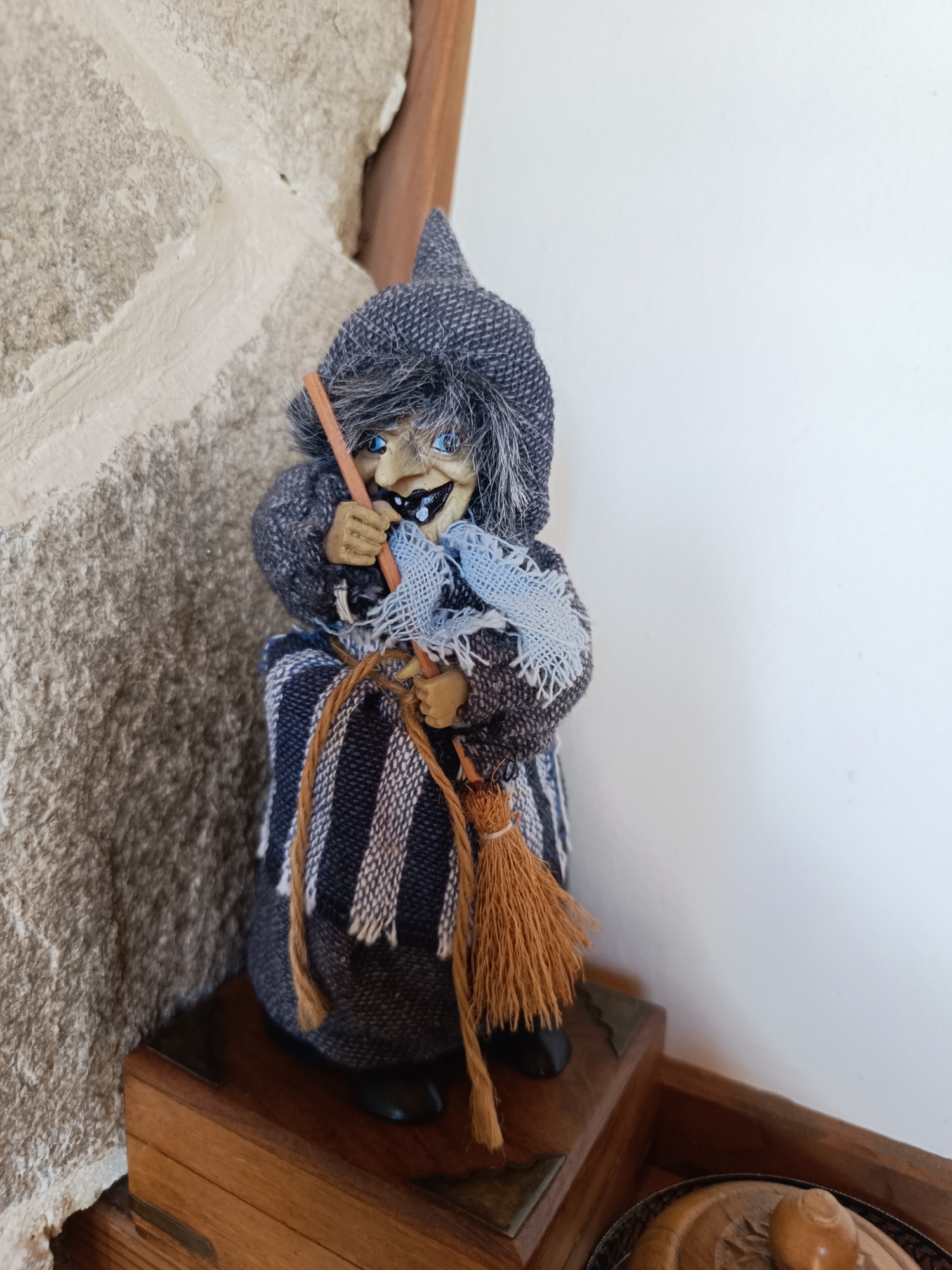 witch doll standing on a wooden box. The witch has a gray, pointed hat and gray hair. She has a blue scarf and a striped dress tied with a brown rope. She is holding a small broom in her right hand and a thin stick in her left hand. The wooden box is sitting next to a light-colored stone wall. A white wall is behind the witch. The location is unknown, although it is allegedly in Septemvri, Bulgaria.