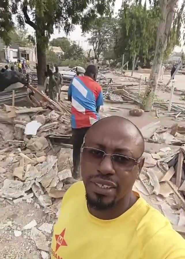man wearing glasses and a yellow t-shirt standing in front of a pile of rubble. The rubble appears to be from a demolished building. In the background, other people are standing and looking at the rubble. The man in the yellow shirt is recording a video and talking. The surrounding environment includes trees and other buildings in the distance.