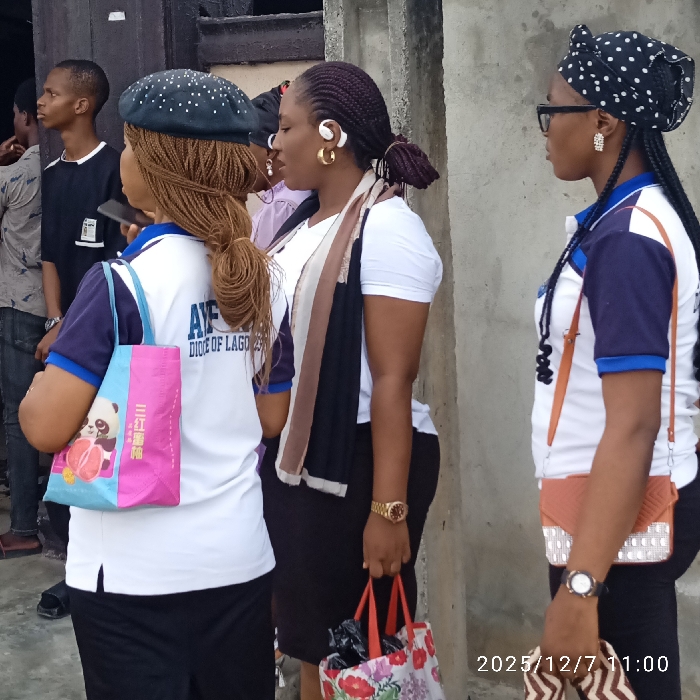 On December 7, 2025, at 11:00, an outdoor scene in Satellite Town, Nigeria, depicts three women in the foreground and several individuals in the background, standing against a light grey concrete wall and a dark wooden doorway