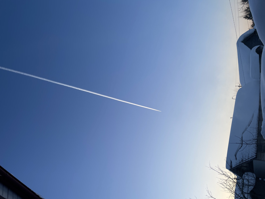 The scene is located in Zav'yalovo, Russia. The image displays a winter exterior at an unspecified time of day, likely morning or late afternoon. The upper two-thirds of the frame show a clear, predominantly blue sky, transitioning to a lighter blue-white hue near the horizon. A single, distinct white contrail from an aircraft traverses the sky diagonally from the upper left corner to the lower right. The lower third of the image features the snow-covered roofs of multiple single-story structures, exhibiting significant accumulations of snow that form undulating shapes. Bare tree branches are visible in the lower left foreground. A dark architectural element, possibly part of a roof overhang, is partially visible in the extreme upper left corner. In the distant background, a line of dark trees, suggestive of a forest, is visible on the right horizon. Overhead power lines are faintly discernible above the structures on the right side. No individuals are present.