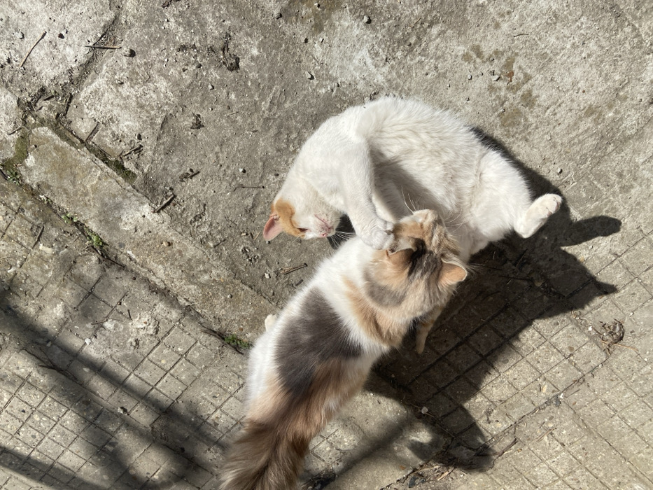 - "Two domestic cats are depicted on a concrete surface in Gulyantsi, Bulgaria, under direct sunlight" by FM-JPbCw2, licensed under CC BY 4.0