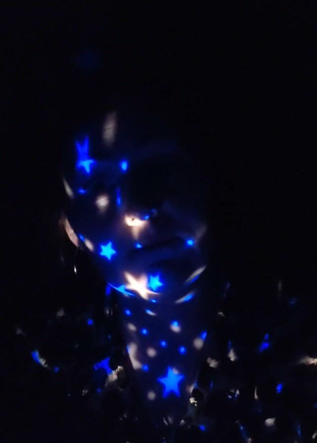 A person is illuminated by a blue and white star-shaped light projection in a dark environment. The light falls across their face and upper body, creating a speckled pattern of stars and circles. The person's face is visible, with one eye appearing more clearly than the other.