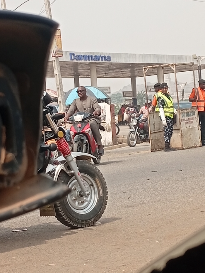 The image presents a daytime street scene in Suleja, Nigeria. In the immediate foreground, partially obscured on the left, is the front wheel, knobby tire, and red-springed suspension of a white and red motorcycle or tricycle. The road surface is asphalt and appears dry. In the midground, a male individual wearing a light-colored, patterned traditional garment and dark sunglasses is seen operating a red and black motorcycle. His head is turned slightly to his right, towards the viewer. Behind him and to his left, a blue and white striped umbrella is visible near a low, light-colored wall. The background is dominated by the "Danmarna" gas station, identified by large blue signage above a multi-lane fueling canopy structure. To the right side of the road, a light-colored concrete barrier or structure serves as a checkpoint. Three individuals are positioned around this barrier. One, in a dark uniform with a yellow-green high-visibility vest and dark cap, stands facing partially left. Another, further to the right, wears a dark uniform with an orange high-visibility vest and a dark cap. A third uniformed individual is partially visible behind the first officer. A white sign attached to the barrier displays black text reading "UP NARTO SULEJA BRANCH & KANTORA." Additional motorcycles and pedestrians are present in the deeper background, indicating active street traffic. The sky is pale and appears hazy.