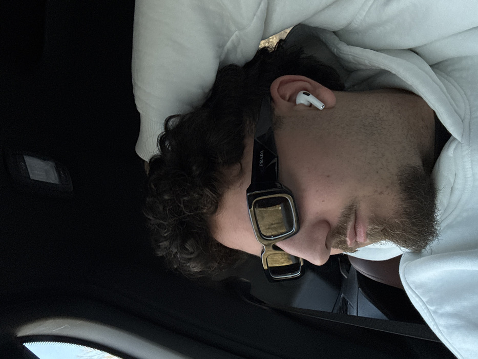 A male individual is depicted in profile, seated in what appears to be the passenger seat of a vehicle in Rahovtsi, Bulgaria. He has dark, curly hair, a mustache, and a short goatee. He is wearing a white hooded sweatshirt, black rectangular Prada brand sunglasses, and a white wireless earbud in his right ear. His head is resting against a white cushion or headrest. The vehicle's dark interior headliner is visible above, along with a rectangular overhead light fixture. A window to the left reveals hints of a natural outdoor environment. A brown interior element is present in the lower background. The individual is looking towards the left side of the frame.