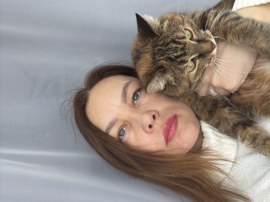 An adult female and a domestic cat are captured in a close-up, indoor portrait, located in Chaikovsky, Russia