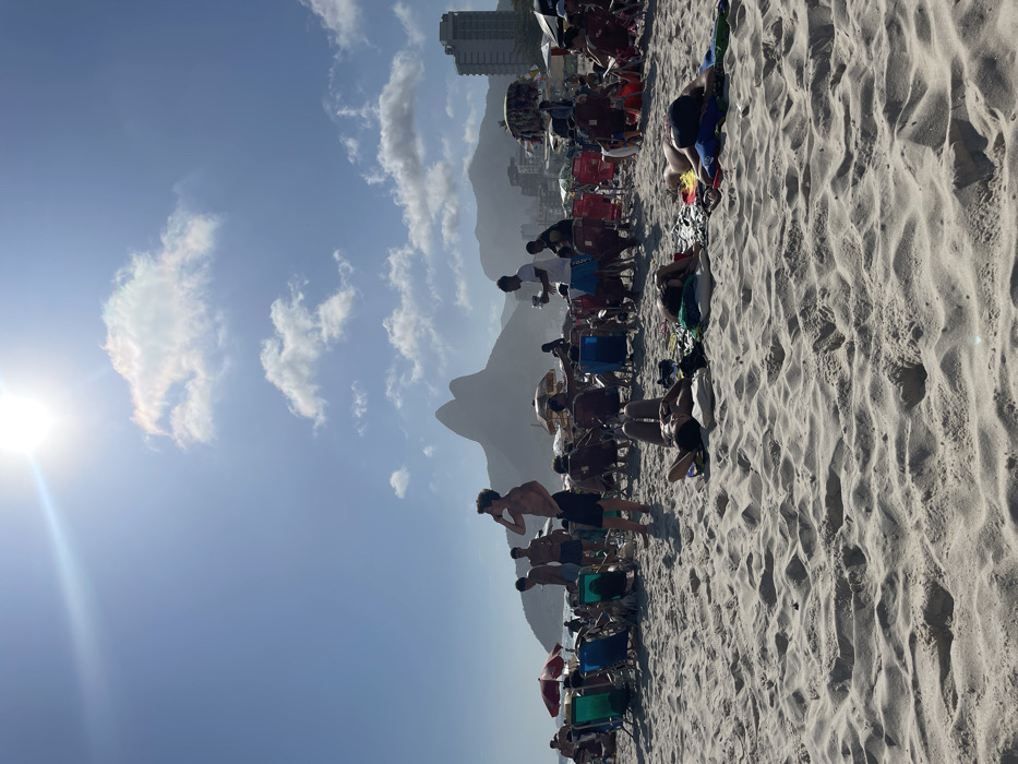A crowded beach scene under a sunny sky. People are relaxing in chairs, sunbathing, and standing on the sand. In the background, a large mountain looms over a city skyline. The sun shines brightly, creating a lens flare in the upper left corner. The sand is light and textured.