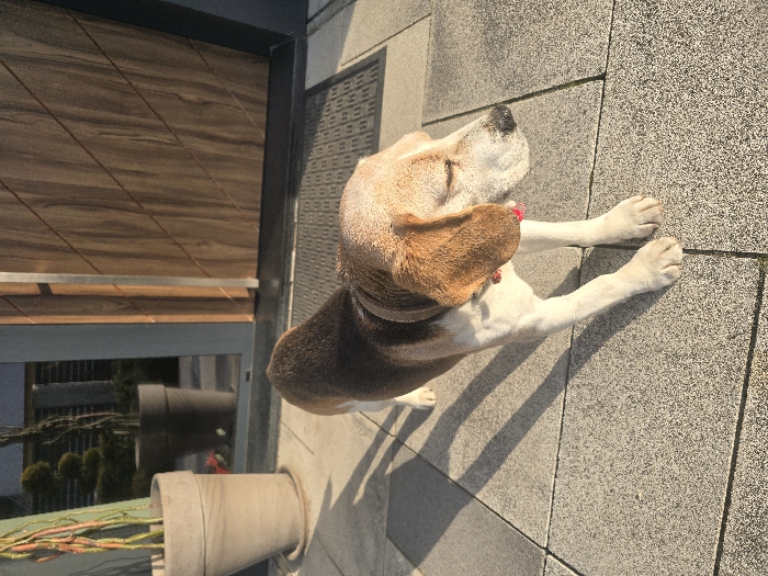 - "A tri-color Beagle dog is positioned outdoors on a light grey tiled surface, likely a patio or entrance, in Bankya, Bulgaria" by FM-MgEU23, licensed under CC BY 4.0
