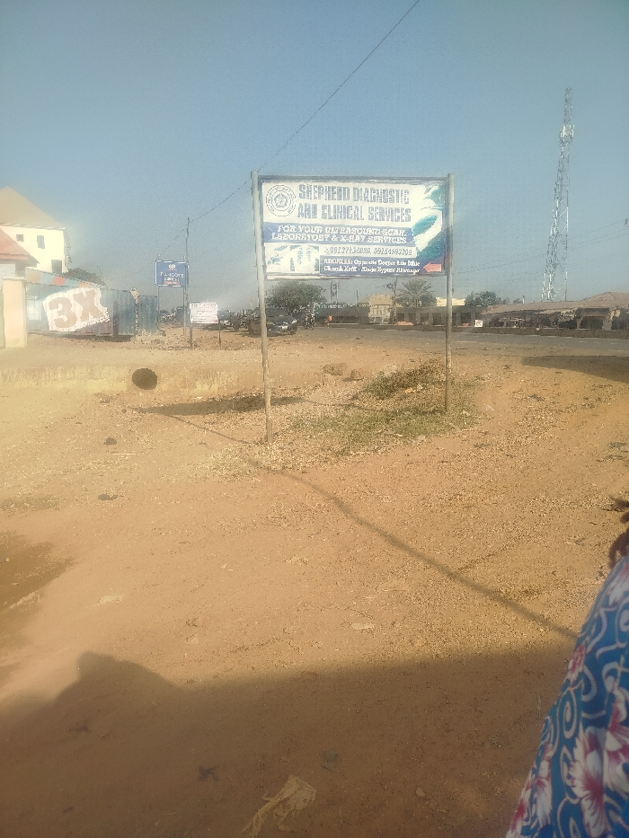 An outdoor scene in Akwanga, Nigeria, depicts a dry, reddish-brown dirt roadside under a hazy blue sky. In the immediate foreground, the lower right quadrant reveals a section of a person's patterned blue, white, and pink fabric garment, along with a distinct, elongated shadow cast on the ground. Dominating the mid-ground is a large, rectangular billboard sign advertising "SHEPHERD DIAGNOSTIC AND CLINICAL SERVICES." The sign specifies offerings such as "ULTRASOUND SCAN, LABORATORY & X-RAY SERVICES" and lists phone numbers: "08077730020, 09054593399." The address provided is "Opposite Gospel Life Bible Church NASS, Abuja Byepass Akwanga." The sign features a crest-like logo and is supported by two metal poles. Sparse green vegetation grows around the base of the sign. To the left of the main sign, a circular dark object, possibly a manhole or drain opening, is visible on the ground. In the background, behind the primary sign, a light-colored building with a reddish roof or trim stands to the left. Adjacent to it, a blue metal container or structure displaying "3X" in white lettering is partially visible, positioned behind a smaller, partially obscured blue sign that appears to read "F-square." A paved road or thoroughfare stretches across the mid-background, populated by multiple parked vehicles, including cars and motorcycles. Farther right in the background, a tall, metal lattice telecommunications tower rises prominently against the sky. Distant buildings and trees line the horizon. A single utility line or cable spans horizontally across the upper portion of the frame.