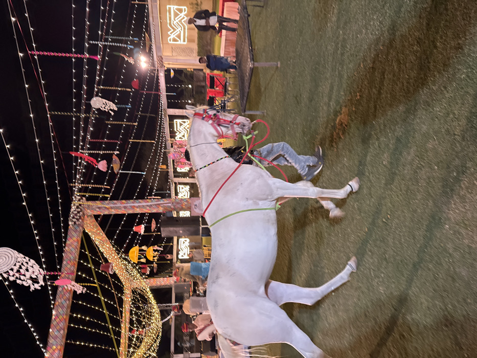 A white horse stands in profile, decorated with a red headstall and green halter, a rider visible behind it. The background features an outdoor event space illuminated with string lights and decorative ornaments. Some figures can be seen standing near the edge of a raised platform, and artificial turf covers the ground.