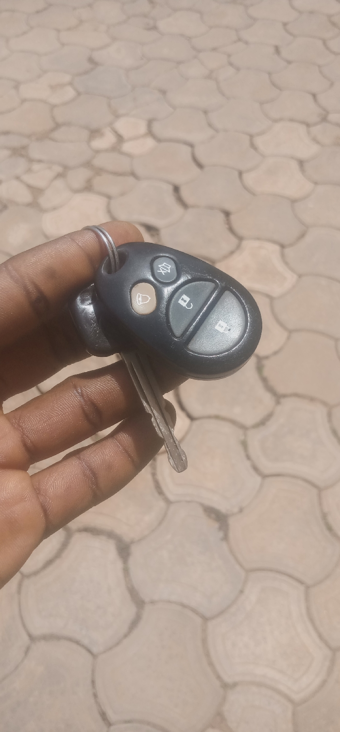 A dark-skinned human hand is positioned centrally, holding a set of car keys. The key set comprises a black automotive remote fob featuring four gray buttons: an alarm mute/off symbol, a bell symbol, an unlocked padlock symbol, and a locked padlock symbol. A single silver metal key blade extends from the fob, and a silver metal keyring attaches the fob to an additional, smaller black accessory, partially visible. The hand exhibits textured skin, and a plain silver band is visible on the finger holding the keyring. The background consists of light-beige interlocking concrete pavers arranged in a repeating, curvilinear pattern, indicating an outdoor paved surface. The location is the city of Unknown, Unknown.