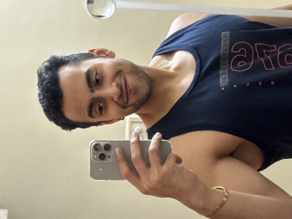 A man takes a selfie in a mirror. He is wearing a dark blue tank top with the word "RELAX" printed on it. He has dark hair, a beard, and a gold bracelet. The background is a plain wall with a light fixture. The man holds his silver iPhone in front of him to take the picture. He has a slight smirk on his face.