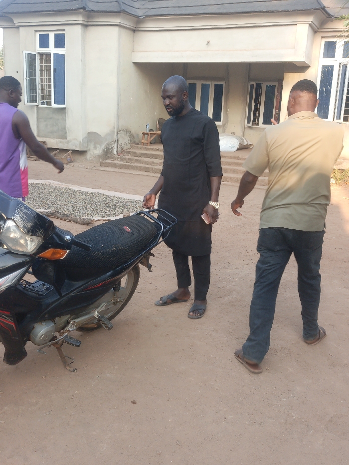 This image, captured in Akwanga, Nigeria, depicts an outdoor scene with three adult males and a motorcycle in front of a building
