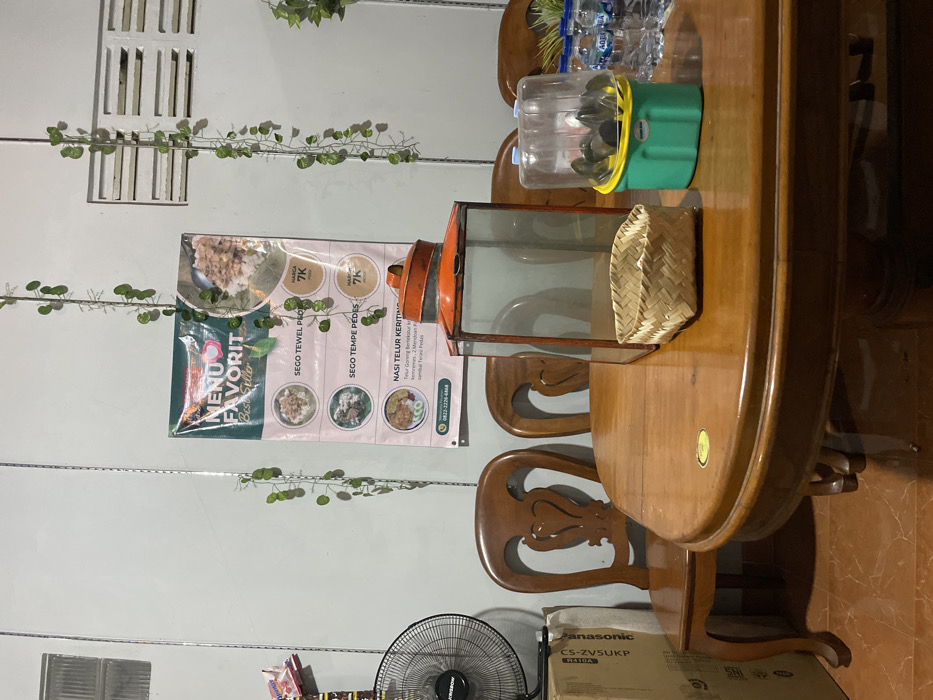 This image displays an indoor dining area within an establishment located in Margorejo, Indonesia. The environment features light grey walls and a brown tiled floor, illuminated by artificial lighting. On the far left, a black Krisbow electric fan rests on a partially visible cardboard box, likely from Panasonic. Several dark brown wooden chairs, characterized by ornate carved backrests, are positioned around a polished, oval-shaped wooden dining table occupying the foreground and mid-ground. A vertical banner labeled "MENU FAVORIT Best Seller" is affixed to the wall behind the table. This banner displays food items such as "SEGO TEWEL PEDES," "SEGO TEMPE PEDES," and "Nasi Telur Keriting," each priced at "7K." Artificial green vine-like plants are suspended vertically on the wall to both the left and right of the menu. A rectangular window with horizontal slats is visible in the upper right section of the wall. Centered on the wooden table are a tall, clear glass container with an orange lid, a small rectangular woven bamboo basket, and a green and transparent plastic utensil dispenser filled with spoons. To the right of these items, multiple plastic bottles of "Aqua" brand mineral water are arranged. The scene is static and devoid of human presence.