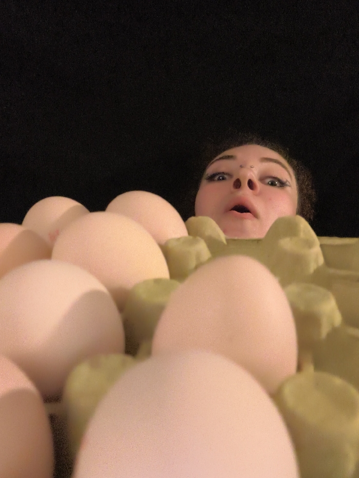 A person peers over the top of a carton full of eggs. The person's face is angled upward, revealing their nose piercing, wide eyes, and open mouth. They are surrounded by eggs in a green carton. The background is black, drawing focus to the subject and the carton. The eggs are predominantly light brown and fill the majority of the frame. The perspective emphasizes the large number of eggs and the person's apparent shock.