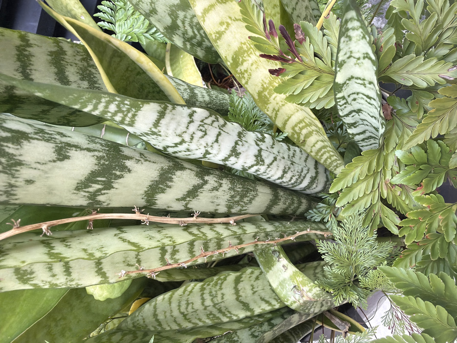A vibrant cluster of snake plant leaves, characterized by their mottled green and white patterns, dominates the image. Sprigs of ferns intermingle with the snake plant, adding delicate textures and diverse shades of green. A thin, brown stem with small nodes stretches across the foliage, contrasting with the lushness of the leaves. The overall composition is dense, creating a rich tapestry of botanical forms.