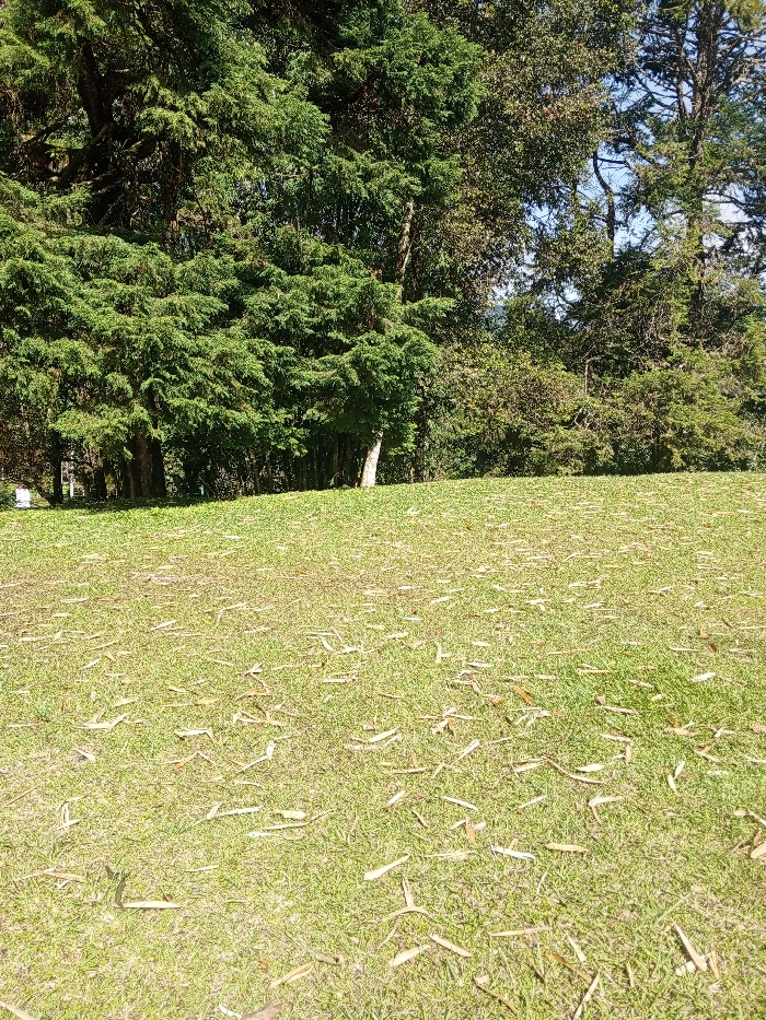A grassy hill dotted with fallen leaves leads to a dense line of trees. The trees vary in type, with some displaying thick, evergreen foliage and others showing more sparse branches. Sky is visible in patches through the trees. The grass covers most of the foreground.