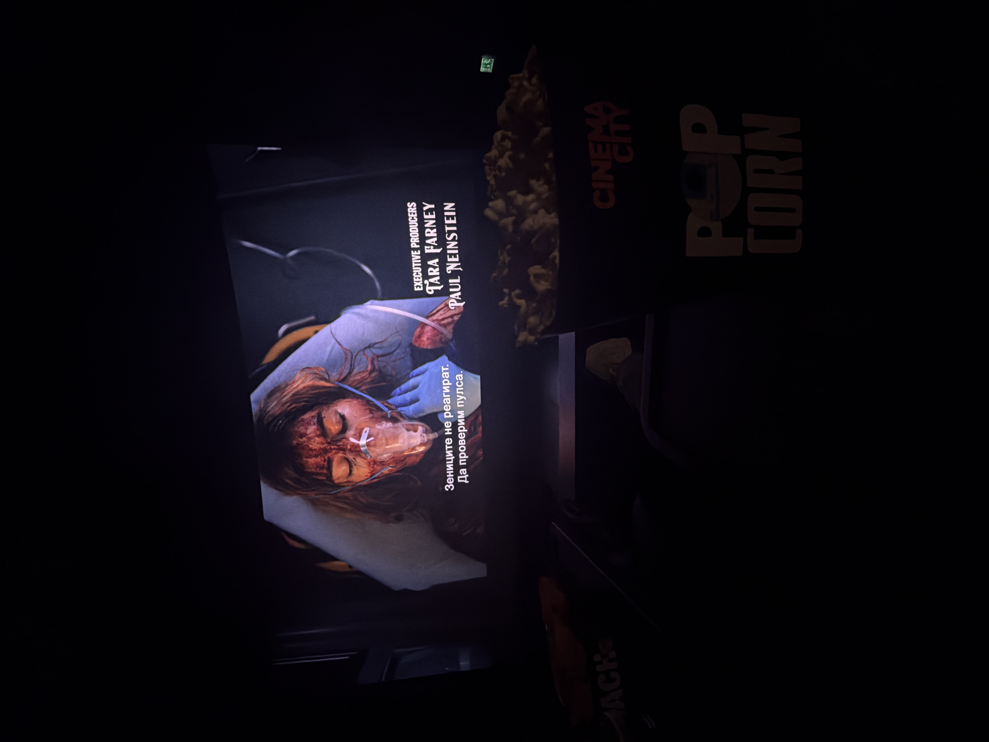 movie screen in a dark theater. The screen displays a scene from a film where a woman with blood on her face and an oxygen mask is lying in what appears to be a hospital bed. Text on the screen, written in Bulgarian, says "Зениците не реагират. Да проверим пулса." which translates to "The pupils are not reacting. Let's check the pulse." Above that, executive producers Tara Farney and Paul Neinstein are credited. The Cinema City logo and a container of popcorn are also visible. The location is a Cinema City theater, which is a movie theater chain, in Sofia, Bulgaria.