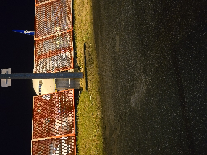 An airplane is parked behind an orange metal fence at night. A tail fin with a logo is visible above the fence. A small section of grass is between the fence and dark asphalt. A metal pole with a sign is also next to the airplane. The lighting is dim, illuminating the fence and plane partially.