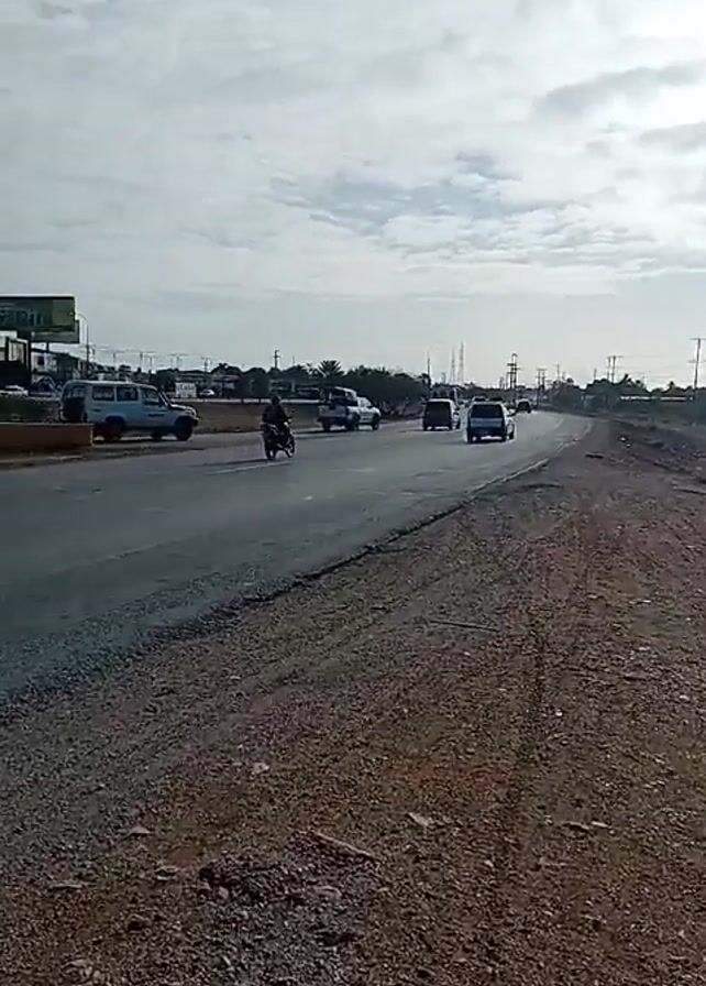 roadside shot of a highway under a cloudy sky. There are several cars driving on the highway. The roadside is gravel and dirt. In the distance are buildings and powerlines.