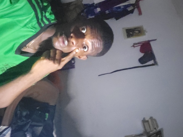 A young man with short, dark hair, wearing a green and black shirt, is looking at the camera, pointing to his eye. He is in a room with a white wall. Above him are some items hanging on the wall, including a photo, a hat, and possibly clothes. The room appears to be dimly lit.