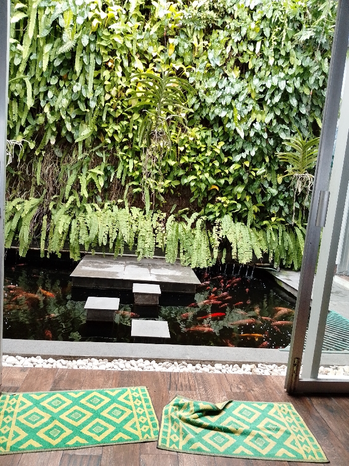 The image captures an outdoor ornamental pond and vertical garden, viewed from an interior perspective, located in Kertonatan, Indonesia