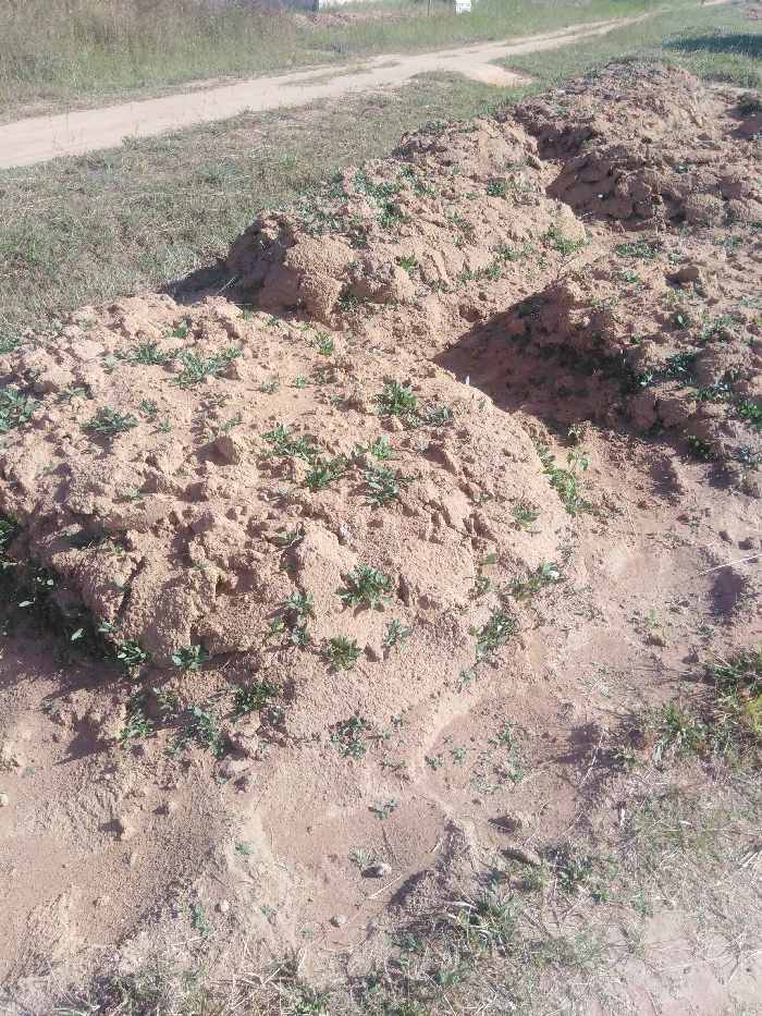 The scene is located in the city of Ban, Nigeria. The image displays an outdoor environment dominated by a series of irregular, light brown earthen mounds, primarily composed of sandy soil, situated across the foreground and midground. These mounds are sparsely vegetated with small green plants emerging from their surfaces and sides. Distinct depressions and natural channels of bare, light brown earth are visible between and around the mounds. The surrounding ground consists of similar sandy soil with scattered patches of dry, light green grass. In the upper background, a light-colored dirt track is present, bordered by dry vegetation. Further in the distance, indistinct structures are visible. No individuals, specific actions, or interactions are observed. The scene is illuminated by direct sunlight, indicating clear daytime conditions.