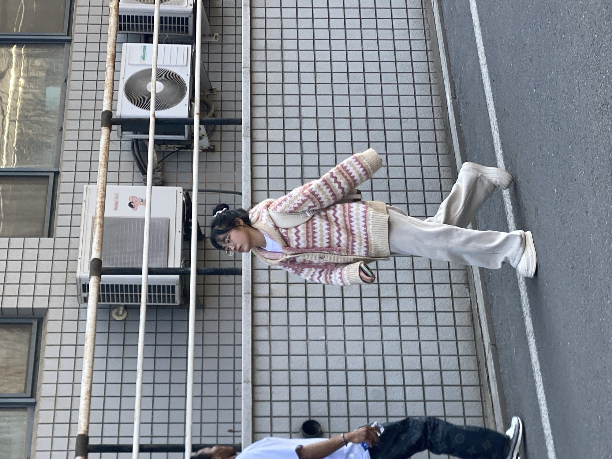 A woman wearing glasses and a pink and white cardigan is walking on a sidewalk. She is wearing light-colored pants and shoes. There is a man sitting on the sidewalk. Air conditioning units are on the wall in the background. The scene appears to be in an urban setting with a tiled wall and a street. The specific location in the city of Zhongtun, China, cannot be determined without additional information or context.