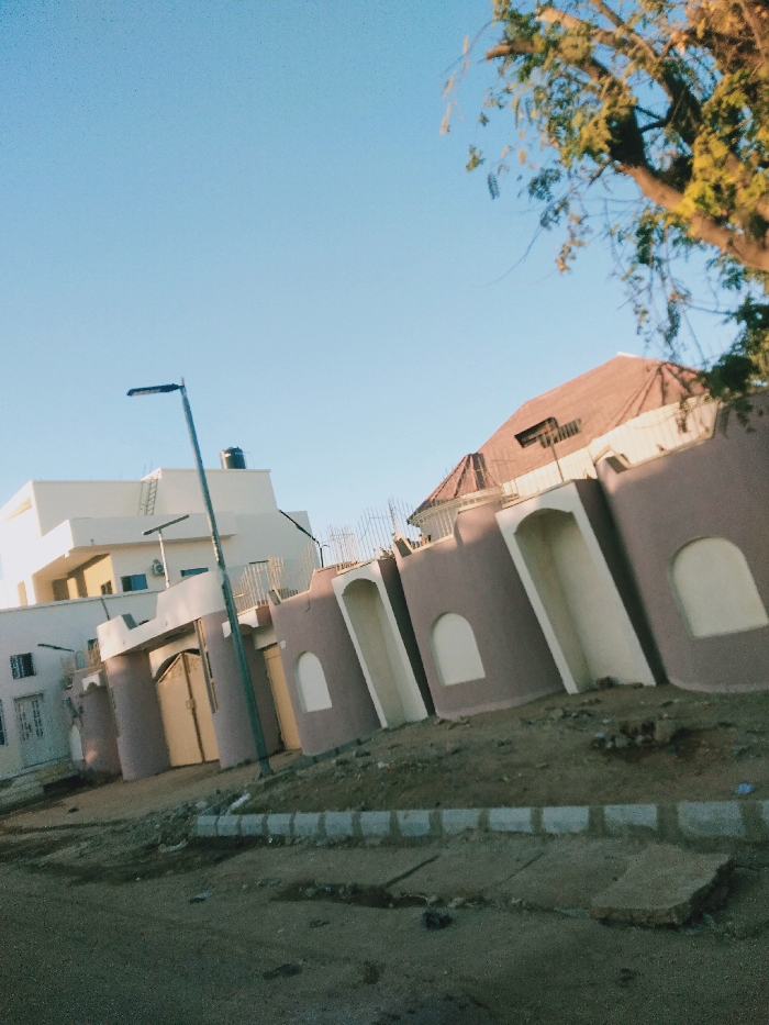 A street view under a clear blue sky features two buildings, one white and modern, the other with a brown roof. A brown wall with white arches separates the buildings from the street. A streetlight stands tall nearby. A tree’s branches reach into the frame from the upper right corner. The pavement in the foreground appears cracked and weathered.