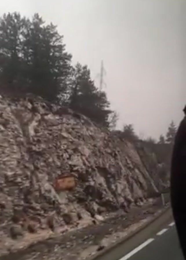 The video depicts a view from a vehicle moving along an asphalt road. A rocky hillside runs alongside the road, with scattered trees and vegetation growing on top. The sky is overcast and the scene is foggy, obscuring the background. Power lines are visible extending above the hillside. The road is marked with white lane lines, including an arrow indicating the direction of travel. A portion of the interior of the vehicle is visible on the right side of the frame.