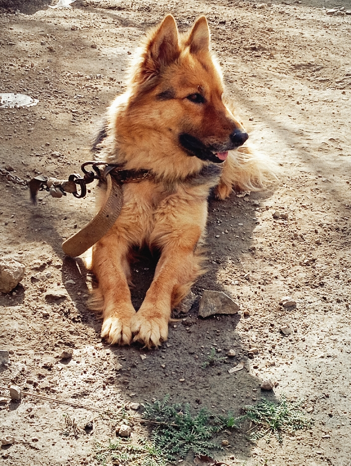 - "A canine subject, consistent with a German Shepherd type breed or mix, with prominent tan and golden fur, lies on packed earth and gravel in Lassan, Pakistan" by FM-aOgcn1, licensed under CC BY 4.0