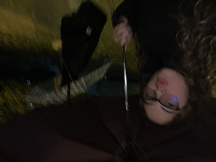 A person with curly hair and glasses is seen from under an umbrella. They hold a selfie stick. The background includes blurry grass and a dark bag. The overall scene is dark and blurry, giving an impression of being outside at night or in low light. The image is rotated, causing the subject to appear upside down.