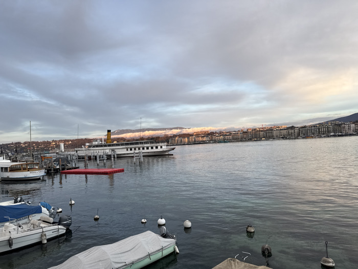 A wide shot of a lake harbor filled with small boats. A large steamboat docks at a pier near the center of the frame. On the other side of the lake, a line of buildings marks the edge of a city. Distant mountains capped with snow are visible in the background. The sky above is filled with clouds, with hints of sunlight shining through.