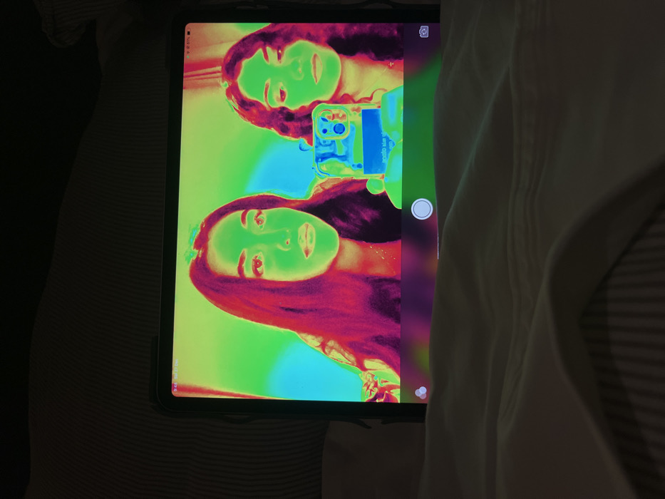 An iPad displays a woman's selfie on its screen with a thermal filter