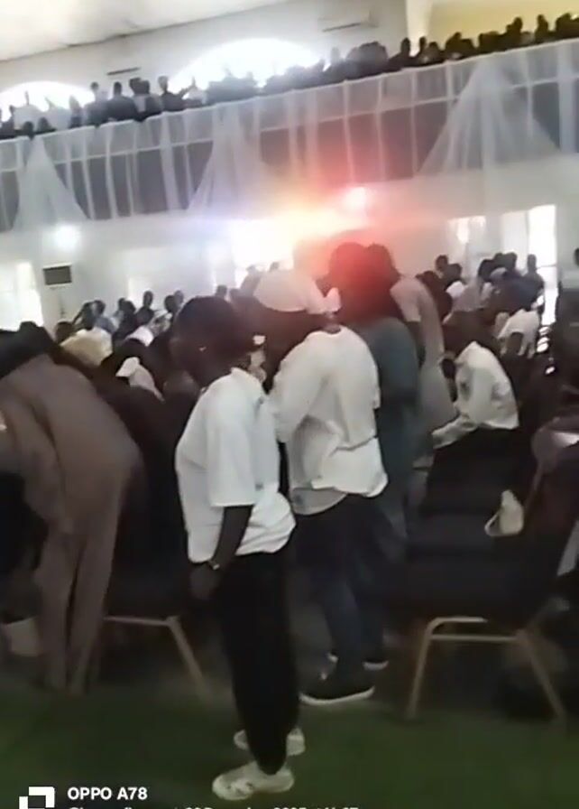 large indoor gathering of people in what appears to be a hall or event space. Many attendees are seated in chairs, while others are standing and moving around. The attire of the people varies, with some wearing white outfits, while others are in casual clothing. In the background, there's a raised platform or stage with a backdrop featuring images of individuals. There is an upper level or balcony in the back with people standing there. The lighting is bright, with some areas being overexposed. Overall, the atmosphere suggests a formal or semi-formal event.