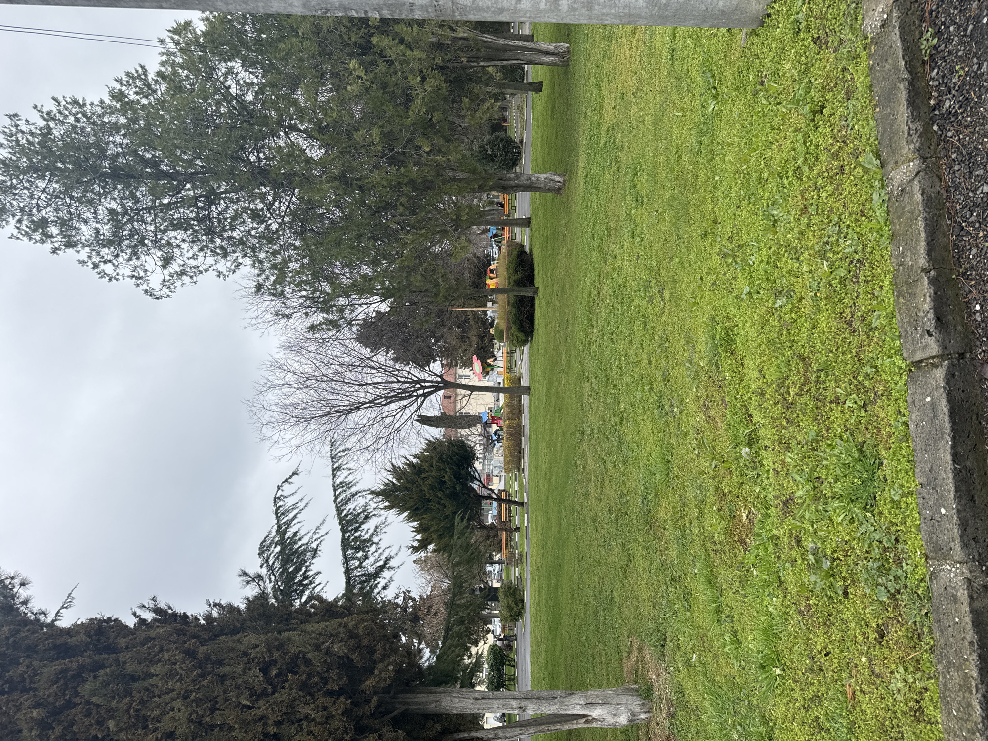 The image depicts a park scene in Kameno, Bulgaria. The park consists of a grassy area lined with mature trees of varying species along a walkway. A gray concrete curb separates the grass from a paved surface on the right side of the image. A playground structure is faintly visible in the background along the walkway. The sky is overcast. There are no visible people interacting within the immediate frame of the picture.