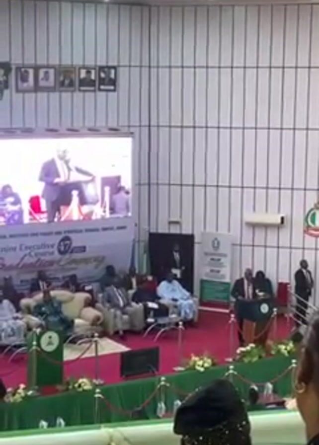 . The video shows an auditorium set up for a graduation ceremony. There is a large screen displaying a live feed of the speaker on stage to the right. The main stage has rows of people seated. The speaker at the podium is addressing the audience. The camera is in the audience, showing attendees seated. The room is well lit. Banners and decorations adorn the stage, and official emblems are visible, suggesting a formal and official event.