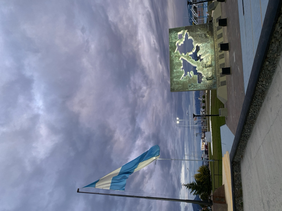 An Argentine flag waves under a cloudy sky. A bronze monument displays a cutout map with figures etched around it. The scene includes a park or public space with streetlights, grass, and possibly a parking area with vehicles in the background. A wall runs along the edge of the viewing area. The photograph seems to be taken at an angle, resulting in a tilted perspective.