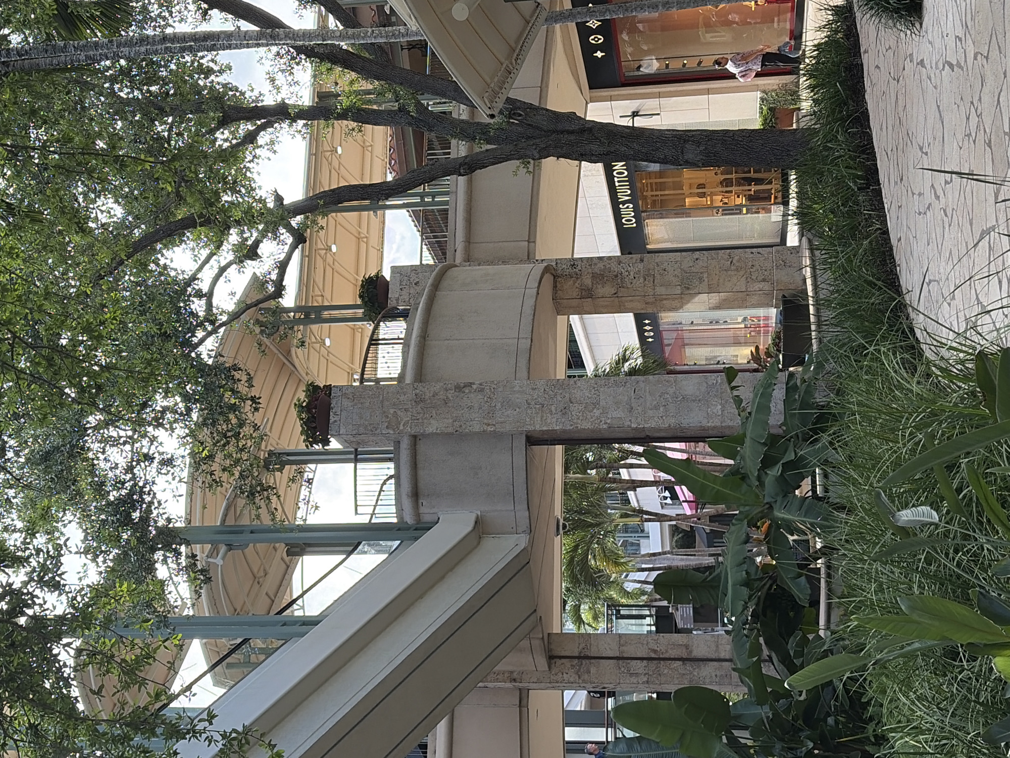 horizontal shot taken in the city of Coral Gables, United States of America. The focus appears to be on a building or commercial structure, possibly a shopping center or retail location. Prominently visible is the Louis Vuitton store, suggesting a high-end shopping district. The architecture incorporates elements like a walkway, a cylindrical concrete structure, and a covered or shaded area, likely designed for pedestrians. The scene includes a variety of greenery, with plants and trees framing the built environment. In the upper right corner, an individual is seen walking near the Louis Vuitton store, adding a human element to the overall urban scene. The composition is angled upwards, capturing the building's height and the interplay between architecture and nature.