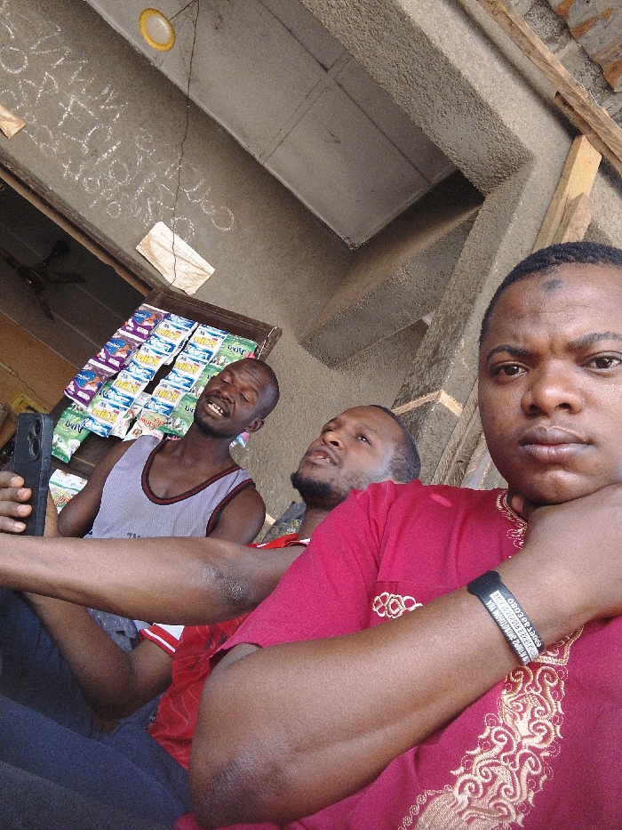 Three adult males are positioned in a semi-enclosed commercial area within Akwanga, Nigeria