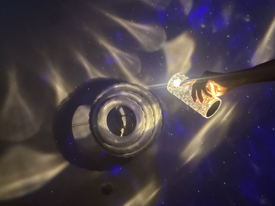 The scene depicts an indoor environment in Oron, Nigeria, focused on a ceiling or wall surface displaying dynamic light projections. The background surface is dark, exhibiting two distinct light patterns: large, wavy formations of amber-white light, suggestive of reflected water, and numerous small, scattered green and blue points of light, resembling stars. In the upper left quadrant, a multi-tiered, circular light fixture, likely a chandelier, is suspended. This fixture appears illuminated from within and possesses reflective surfaces. A human hand and part of a forearm extend upwards from the lower right of the frame, holding a translucent, cylindrical object. This object features a textured, possibly faceted surface and emits a bright, warm light, illuminating the gripping hand and contributing to the ambient light effects. The object functions as a portable light source or projector.