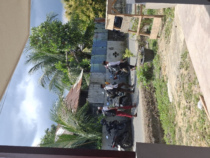 A sunny outdoor scene features three people standing near parked motorcycles on a narrow road. They appear to be wearing uniforms with white shirts. Lush tropical vegetation, including palm trees, surrounds the area. A simple wooden ladder rests near a concrete platform. Blue corrugated metal and older, tiled roofs are visible behind the people. The ground is a mix of dirt, grass, and concrete.