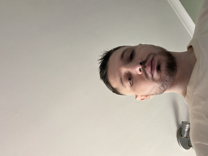 The image, rotated 90 degrees counter-clockwise, depicts an adult male from the chest up, positioned in the lower-left quadrant of the frame